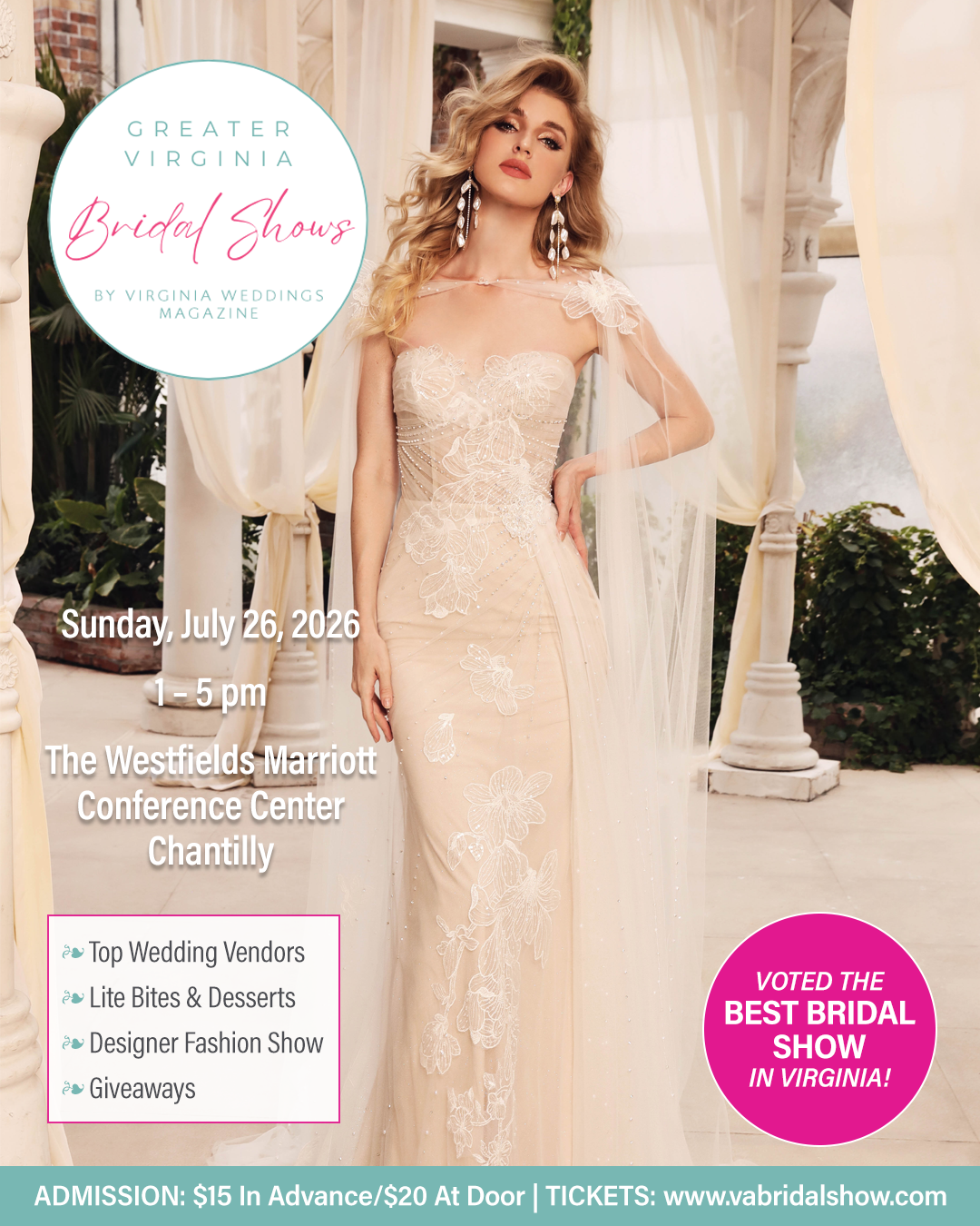Back to All Events The Northern Virginia Bridal Show Sunday, July 26, 2026 1:00 PM 5:00 PM Google Calendar ICS